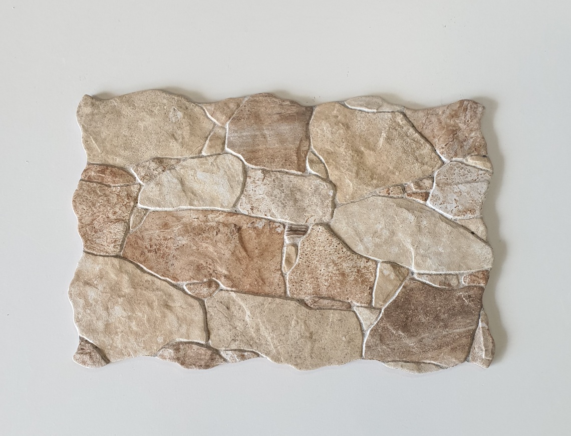 These stone effect ceramic tiles feature a realistic stone texture with warm earthy tones that bring elegance and natural depth to any space.